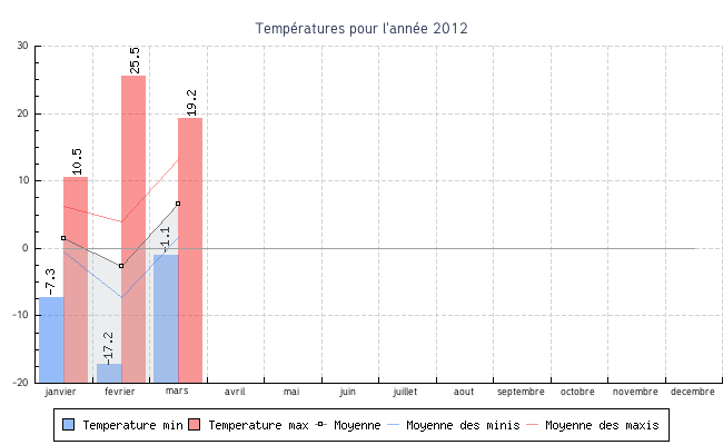| fevrier | -17.2 °C | -7.3 °C | 25.5 °C | 4.0 °C | -2.6 °C | 0.9 km/h | 29.5 km/h | O |