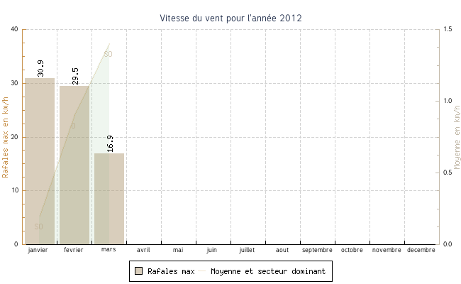| mars | -1.1 °C | 1.6 °C | 19.2 °C | 13.1 °C | 6.6 °C | 1.4 km/h | 16.9 km/h | SO |