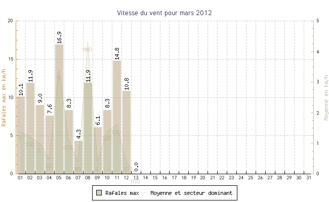 | 12 | 2.1 °C | 13.9 °C | 6.9 °C | 0.4 km/h (10.8 km/h) | S |